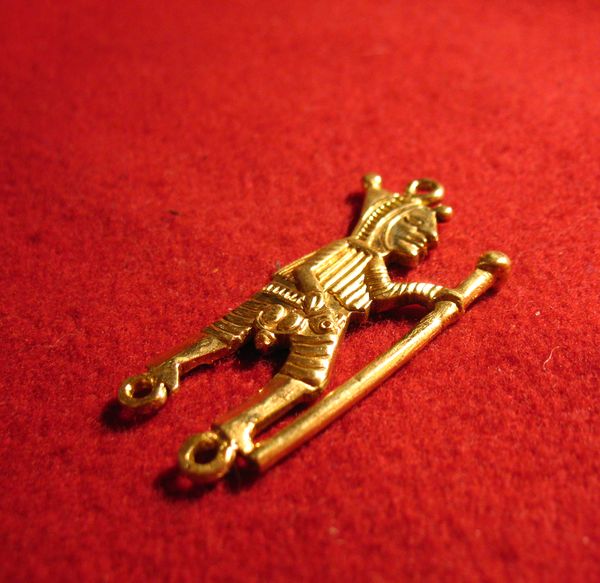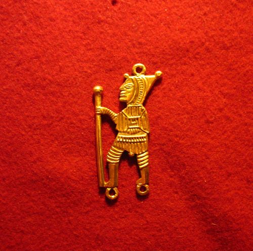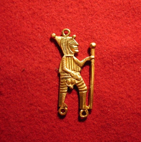 Бэдж неприличный. Изображает паломника в традиционной одежде. Двусторонний - одна сторона приличная, другая неприличная. С обратной стороны он демонстрирует гениталии. Мог быть сатирой на паломников и паломниц, чьей настоящей целью были эротические приключения. И это не какая-то выдумка, но описано в «Кентерберийских рассказах» Дж. Чосера. Либо намекать на плутовской сюжет о таком пилигриме. К тому же, существовали своеобразные «профессиональные пилигримы». Которые за деньги совершали паломничества вместо других и торговали поддельными реликвиями. Вот про такие и становились персонажами плутовских фаблио с пилигримами-пройдохами. В том числе с эротическим подтекстом. 1300-1350, Нидерланды. Пришивается за посох. По книге Jos Kolderweij "Sieraad en devotie in middeleews vlaandreen".