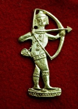 Бэдж изображает лучника с рогом на пояса (возможно, охотника на оленей). Он натянул лук и готовится выпустить стрелу. Охота и стрельба из лука были популярным видом досуга. Лучники средневековой Европы были либо специально обученными воинами, либо членами обществ, в которых лук был предметом повседневного употребления. К началу Столетней войны (1337−1453 гг.) английское правительство тратило значительные силы и средства на укоренение стрелковых традиций. Старое, ещё донормандское ополчение постепенно заменяет мощный мобилизационный резерв лучников: каждый свободный мужчина был обязан иметь лук и регулярно упражняться в стрельбе. Таким образом, вся Англия представляла собой как бы мобилизационную базу стрелкового ополчения (по крайней мере, на бумаге). Не говоря уж о том, какой популярностью в Средневековой Европе пользовались состязание лучников и насколько популярным был этот вид досуга. Также из католических святых охотником был св. Губерт. И возможна их связь со св. Губертом – покровителем охоты. Относится к турнирным и праздничным значкам. Их охотно покупали как сувенир в честь памятного волнующего события. Их отчасти возможно сравнить с современными значками спортивных фанатов. Англия, XIV-XV век.