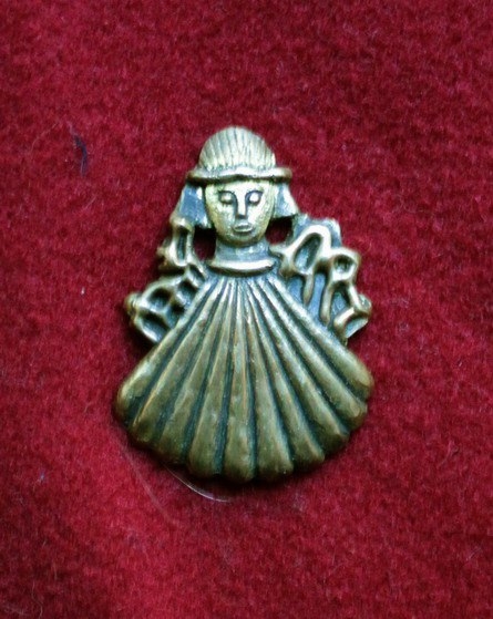 Изображает мужчину в шляпе паломника, одетого в длинное расширяюшееся книзу одеяние наподобие плаща. В сравнении с остальными представленными бэджами выглядит более схематичным. Но таким образом его одеяние намеренно уподобляют раковине - общесредневековому символу паломничества. А веерообразные складки одежды расходятся как складки на ракушке морского гребешка. Символ паломничества к святым местам интерпретируется более подчеркнуто и заостренно. Франция, ХIII-XIV в. По книге "Pilgrim souvenirs and Secular badges".