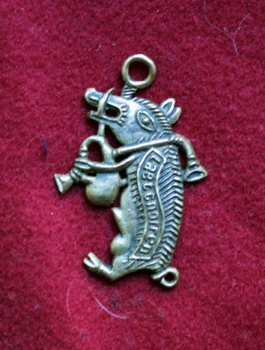 Изображает кабана, играющего на волынке. В этом бэдж кабан предстает как дьявольский символ. В бестиариях его описывают как щетинистого зверя, живущего во тьме, который безобразен и вспыльчив. Кабан неистов и вечно роет землю, ни минуты не обращая внимания на небеса. Его клыки торчат из пасти, он грязный и вечно роется в нечистотах. Лень кабана также делает его греховным созданием. В средние века в христианском искусстве свинья являлась символом алчности и вожделения. Он играет на волынке. Которая тоже наделялась символикой разврата. Да и визжащий звук "дьявольских волынок" напоминал церковникам крик свиньи. Паломники могли носить его как напоминание о греховности дьявольских искушений. Нидерланды, 1330-1410, По книге Jos Kolderweij "Sieraad en devotie in middeleews vlaandreen".