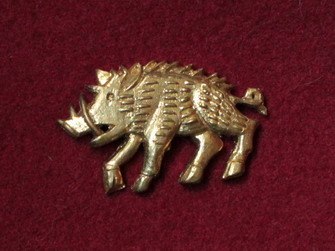 Бэдж в виде кабана. Белого кабана избрал своей эмблемой Ричард, герцог Глостерский (позже Ричард III). Входит в коллекцию рисунков, в основном, йоркистских эмблем, сделанную ок. 1466-70 гг. В 1483 г. отчеты королевского гардероба показывают, что в июле были изготовлены тысячи бэджей с кабанами для коронации Ричарда III. Англия, 1483-84 гг. По книге Brian Spencer "Pilgrim souvenirs and Secular badges".
