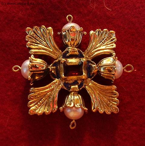 Брошь с портрета Герцога Бургундского из книги "Geloof & Geluk sieraad en devotie in middeleeuws vlaandern".Эмаль, искусстенно выращенный жемчуг, гранат.