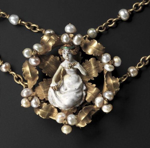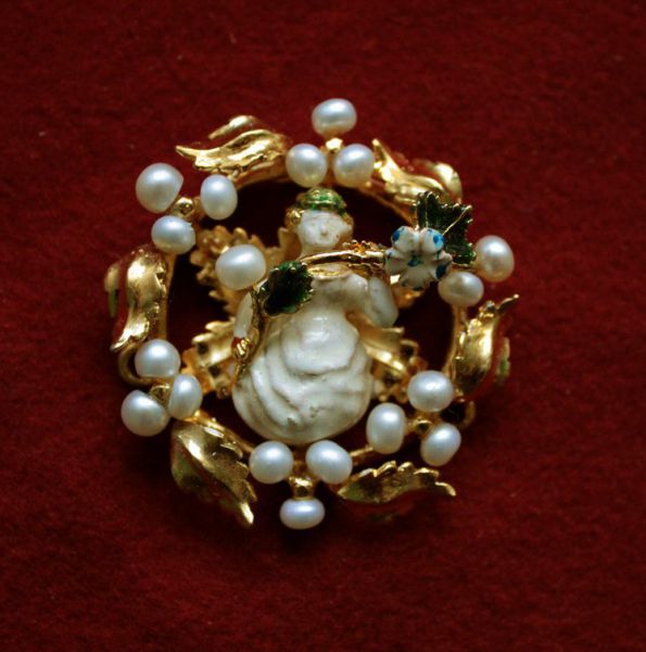 Центральный брошь ожерелья из Кливленда. Поздний 14 - начало 15 века, изготовлены предположительно в Париже, Франция. Латунь, позолота, жемчуг. стеклянные камни, холодная эмаль.Пришиваются на одежду или головные уборы