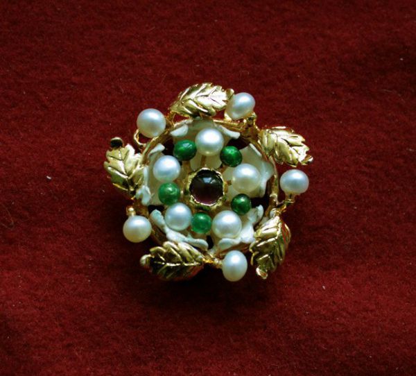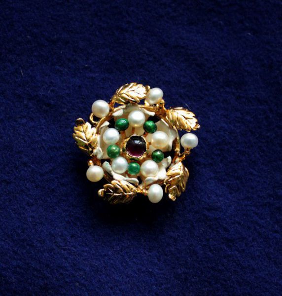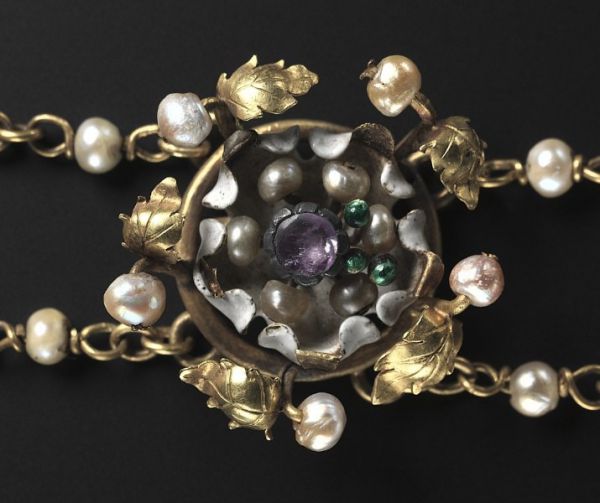 Брошь ожерелья из Кливленда. Поздний 14 - начале 15 века,зготовлены предположительно в Париже, Франция. Латунь, позолота, жемчуг. стеклянные камни, холодная эмаль.