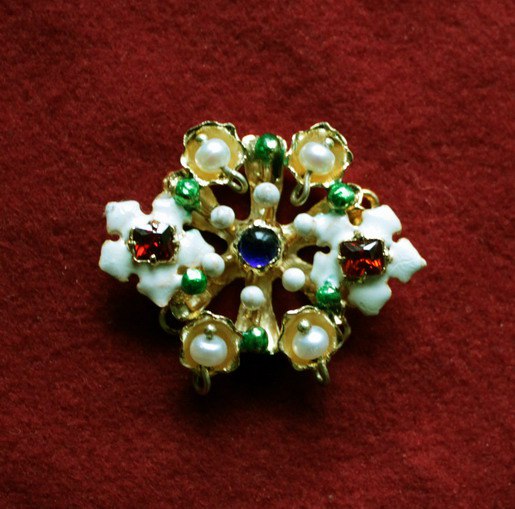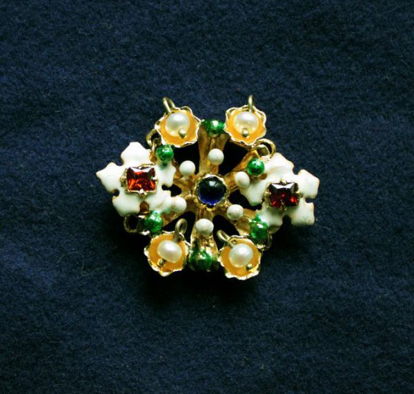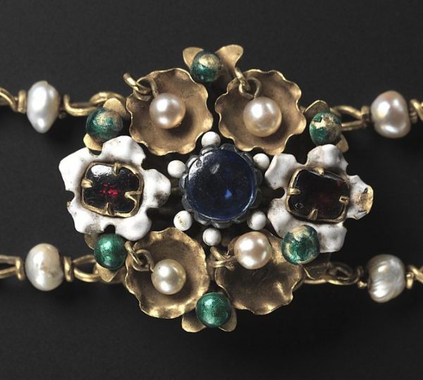 Брошь ожерелья из Кливленда. Поздний 14 - начале 15 века,зготовлены предположительно в Париже, Франция. Латунь, позолота, жемчуг. стеклянные камни, холодная эмаль.