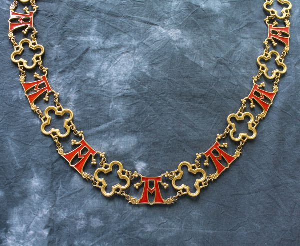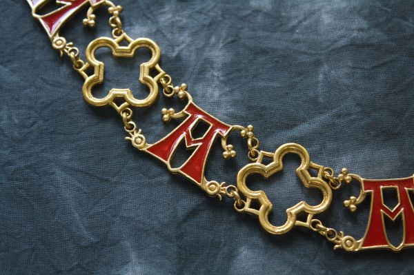 Рыцарская цепь с цветными буквами "А и квадрифолием (четырехлистником). С этой буквы начинается латинская католическая молитва к Богородице "Ave Maria". Звено «А» Является стилизацией на основе поясной накладки в виде буквы «А» - XIV век, Франция (арт. еn47) из музея Баден-Бадена. Квадрифолий — характерный средневековый мотив декоративного обрамления в виде комбинации квадрата и цветка с четырьмя симметричными лепестками. Стандартная цепь включает 26 звеньев. Литье из латуни, холодная эмаль. Вы можете выбрать любой цвет эмали - укажите желаемый цвет в примечаниях к заказу. Цвет по умолчанию красный. Состоит из 26 звеньев. Длина цепи около 1 метра.