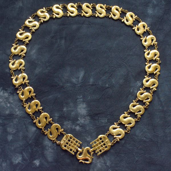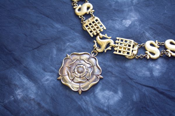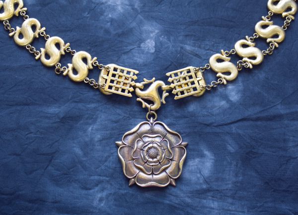 изображенного на портрете сэра Томаса Мора работы Ганса Гольбейна Младшего. Считается, что буква S означает "Sovereignly". С подвеской в виде Розы Тюдоров. Роза Тюдоров (английская роза, роза Союза; англ. Tudor rose, English rose, Union rose) — традиционная геральдическая эмблема Англии. Эти цепи были знаками высокого статуса и лояльности Джона Гонтского, герцога Ланкастерского (1340- 99), его сына Генриха, который стал королем Генрихом IV в 1399 году, и других королей династии Ланкастеров Генриха V и Генриха VI. Тем, кого король желал почтить, были вручены рыцарские цепи разной степени ценности. Англия, 15-16 вв. Длина цепи около 90 см (26 звеньев), ширина S-звеньев 30 мм. Подвеска роза в комплект не входит.