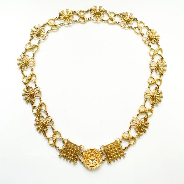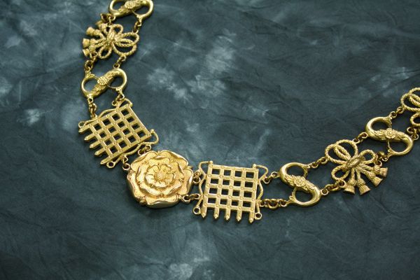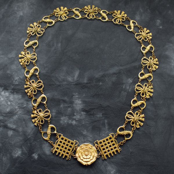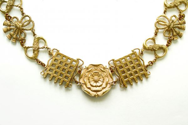Реплика Цепи Канцелярии, широко распространенной в Англии XV-XVI века. Ее носил Лорд-глава Канцелярии. Сделано по золотой рыцарской цепи 1546-7 годов, возможно, подаренной Генрихом VIII сэру Эдварду Монтегю между 1546-7 гг. Считается, что буква S означает "Sovereignly". Подвеска в виде Розы Тюдоров из ожерелья сэра Томаса Мора, Англия, 14-16 вв. Роза Тюдоров (английская роза, роза Союза; англ. Tudor rose, English rose, Union rose) — традиционная геральдическая эмблема Англии и Гэмпшира (первоначально — в гербе короля Англии Генриха VII как символ объединения враждовавших королевских династий Ланкастеров и Йорков). Воспроизведено по изображению с портрета сэра Томаса Мора работы Ганса Гольбейна Младшего. Высота кулона 65 мм. Общая длина около 100 см, состоит из 12 S-образных звеньеы, 11 геральдических переплетенных узлов, 2 звеньев-решеток и тройной розы Тюдоров в центре.