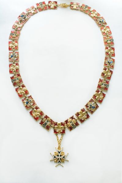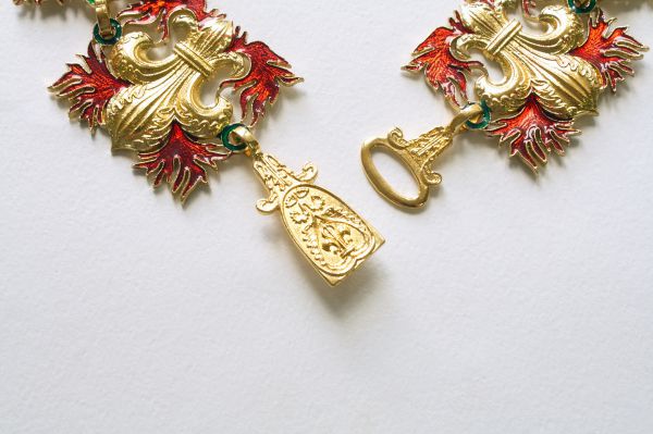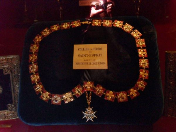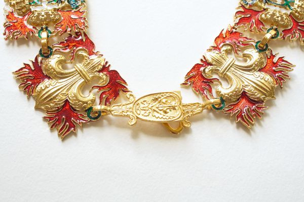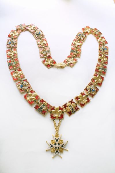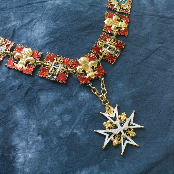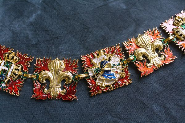 Рыцарская цепь Ордена Святого Духа. Франция, XVI век. Используется три вида звеньев: с мотивом геральдической лилии fleur-de-lys (флер-де-лис); с тремя геральдическими коронами, рогами изобилия и языками пламени; геральдическим рыцарским шлемом, стрелами и языками пламени. Подвеска в виде звезды золотого мальтийского креста с шариками на концах и золотыми геральдическими лилиями в углах. Крест обрамлён широкой каймой белой эмали и имеет на плечах языки пламени зелёной эмали, исходящих от центра креста. Центральный медальон с лицевой стороны знака золотой и также покрыт зелёной эмалью в виде языков пламени. Поверх креста и медальона наложен символ Святого Духа — летящая вниз золотая, покрытая белой эмалью, голубка с распростёртыми крыльями. высший орден Французского королевства в период Старого порядка. Учреждён 31 декабря 1578 года королём Генрихом III. Учреждением нового ордена король надеялся привлечь на свою сторону католическую знать Франции, всё более склонявшуюся под знамёна герцога Генриха де Гиза и руководимой им Католической лиги. Девизом ордена стало: «Duce et Auspice» (Предводительствуя и покровительствуя). Латунь, литье, золочение, холодная эмаль. Ширина звеньев ~ 45 мм. Вариант ,большой на 29 звеньев и застежки.