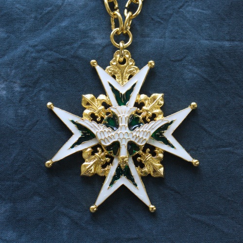 Подвеска Ордена Святого Духа в виде звезды золотого мальтийского креста с шариками на концах и золотыми геральдическими лилиями в углах. Крест обрамлён широкой каймой белой эмали и имеет на плечах языки пламени зелёной эмали, исходящих от центра креста. Центральный медальон с лицевой стороны знака золотой и также покрыт зелёной эмалью в виде языков пламени. Поверх креста и медальона наложен символ Святого Духа — летящая вниз золотая, покрытая белой эмалью, голубка с распростёртыми крыльями. Франция, XVI век. Литье из латуни, золочение, холодная эмаль. Размеры: 700х750 мм.