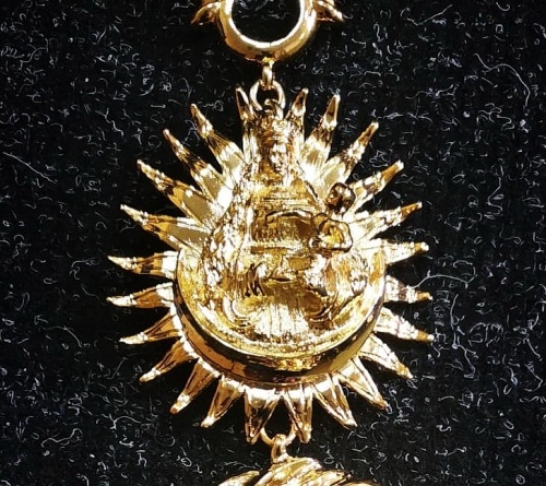 Медальон Богоматери из рыцарской цепи Ордена Лебедя. Богоматерь с младенцем представляли собой общехристианские символы, а луна и солнечные лучи обозначали их славу.