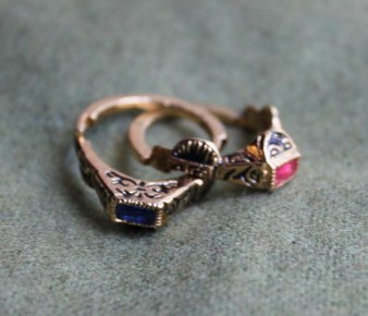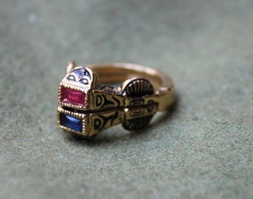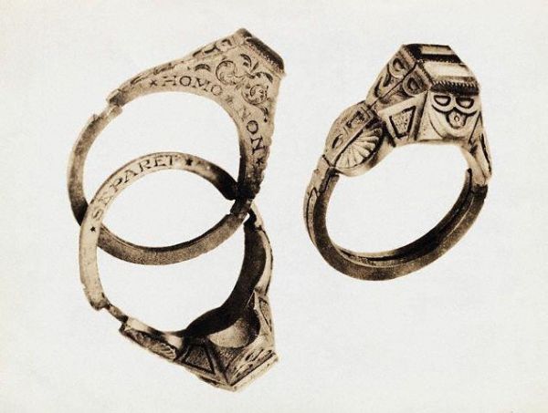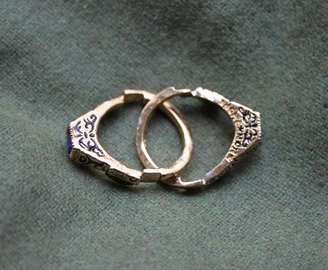Двойное составное кольцо, возможно, обручальное. Германия, 16 век. По ободку идёт надпись "HOMO NON SEPARET" ("Пусть человек не разъединяет"). Кольцо позолочено, выемки заполнены холодной эмалью. Размеры с 18 по 22.