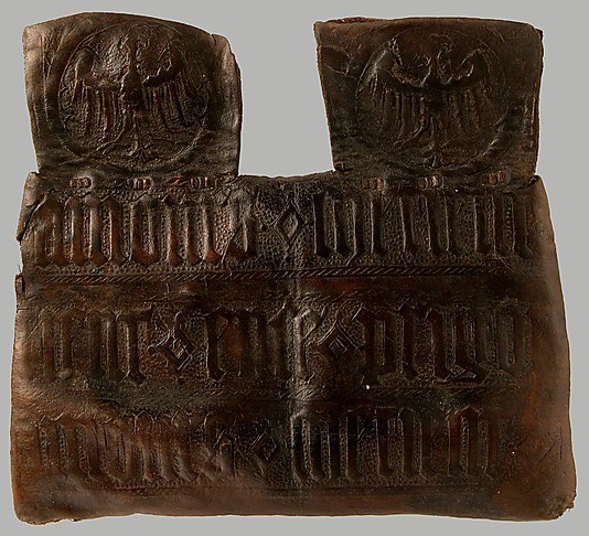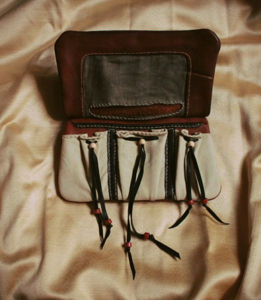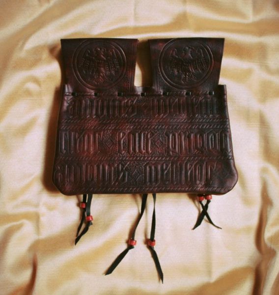 Сумка средневековая с тиснением и кармашками 15 век. Сделана по оригинальному изображению находки из Nieuwlande (Швейцария), опубликованному в книге Олафа Гаубица "Purses in Pieces". На сумке размещён текст на старофранцузском: