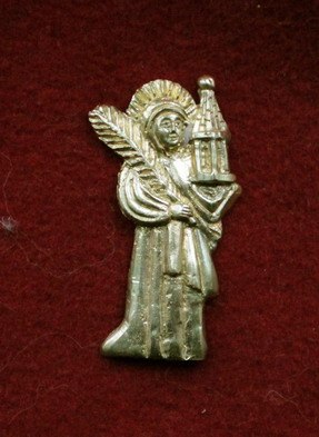 Изображает святую Варвару Илиопольскую с башней и пальмовой ветвью. Она почитается верующими как защитница от внезапной и насильственной смерти. В Католической церкви входит в число четырнадцати святых помощников.В римско-католической церкви святой Варваре приписывается, кроме дара спасать от внезапной и насильственной смерти, ещё дар спасать от бури на море и от огня на суше; она с древних времён считается католиками также покровительницей артиллерии. Почитается православной, католической, коптской, армянской и англиканской церквями как святая. Неизменные атрибуты святой - пальмовая ветвь и башня. Предположительно, Англия XIV в.