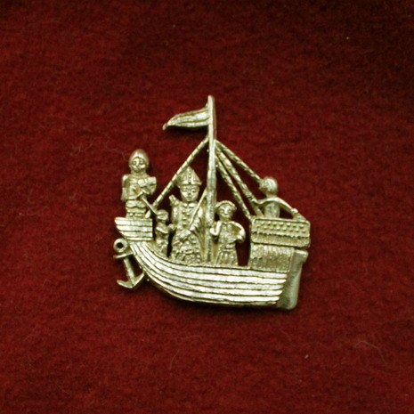 Паломнический бэдж в виде корабля с плывущими на нем людьми, включая Томаса Беккетта в епископском облачении. Имеет отношение к культу св. Томаса Беккетта - покровителя политиков. Бэдж изображает эпизод из жизни св. Томаса. Он был назначен архиепископом Кентерберийским 23 мая 1162 года. Однако в какой-то момент в течение оставшейся части этого года, вопреки желанию короля, Беккет ушел с поста канцлера. Его действия вбили клин между ним и королем, и с этого момента отношения Беккета с Генрихом начали ухудшаться. Последовала серия споров по поводу разделения власти между короной и церковью. К 1164 году напряженность достигла рекордно высокого уровня, и в октябре Беккета вызвали на королевский совет и приказали лишить его всего личного имущества. Епископ Кентерберийский отказался принять условия своего наказания и, опасаясь дальнейших последствий со стороны короля, бежал во Францию. Беккет оставался в изгнании во Франции шесть лет. Он обратился к Папе, и под значительным давлением Рима король Генрих согласился возобновить переговоры с Беккетом. После этого архиепископ и король впервые с 1164 года поговорили наедине, и Генрих пообещал восстановить права Беккета как архиепископа Кентерберийского. Бекета заверили, что он может безопасно вернуться в Англию. Беккет вернулся из изгнания 1 декабря 1170 года. Возвращение архиепископа Кентерберийского в Англию в 1170 г. стало его триумфом. Лодку, которая доставила его с корабля к берегу, верующие несли на руках до Кентербери. Современники описывали Беккета как умного, обаятельного и авторитетного человека. Был архиепископом Кентерберийским с 1162 года до своего убийства в 1170. Он почитается как святой и мученик как католической церковью , так и англиканской общиной . Томас Беккетт вступил в конфликт с Генрихом II, королем Англии , из-за прав и привилегий церкви и был убит последователями короля в Кентерберийском соборе . Вскоре после смерти он был канонизирован Папой Александром III . Англия, Лондон, конец XIV века.