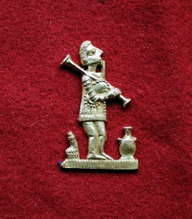 Бэдж изображающий уличного музыканта (жонглер, шпильман), играющий на волынке. У его ног стоит кувшин, намекающий на веселую пирушку. Волынка - один из популярных народных инструментов средневековья. Она была незаменима в оживленных играх и танцах. Вместе с тем, отношение к ней было двояким. Игра на этом инструменте считалась низшей, площадной музыкой. А сам инструмент из-за формы, напоминающей гениталии, воспринимали как эротический символ. Любителей волынки причисляли к когорте дураков, а теолог 13 века Бертольд Регенсбургский называл ненавистных ему менестрелей "волынкой дьявола". Но волынщики могли сопровождать и королевские процессии, и свадебные пиры феодалов. Нидерланды, 1410-1450гг. По книге Jos Kolderweij "Sieraad en devotie in middeleews vlaandreen".