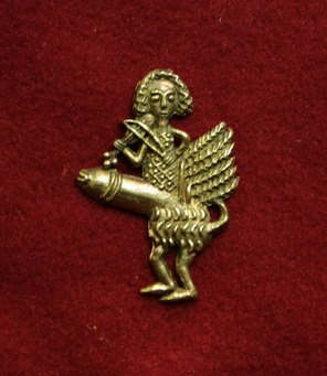Бэдж изображает фантастическое создание с человеческим телом, птичьими крыльями и огромным эрегированным фаллосом. Существо играет на средневековом музыкальном инструменте (возможно, ребеке). Подобное художественное игровое сочетание несочетаемых форм и сами изображения называются гротеском. Соединение человека с животным — любимый средневековый юмористический прием сочетания несочетаемого. Такие гибриды намекали на греховную природу, на зверя, скрытого в человеке. Что одновременно сочетается с комическим карнавальным эффектом. Средневековая пародия была элементом карнавальной культуры; мир переворачивался, все менялось местами, на первый план выходило низкое, непристойное. Истоки этого исследователи усматривают в ритуалах плодородия. Нидерланды, Нидерланды, 1350-1400гг. По книге Jos Kolderweij "Sieraad en devotie in middeleews vlaandreen".