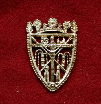 Представляет собой изображение распятого Христа, окруженного орудиями Страстей Христовых, включая терновый венец, копье Логина, гвоздь и т.д. Сцена заключена в гербовую форму, увенчанную геральдической короной. Англия, XIV- XV в. По книге Brian Spencer "Pilgrim souvenirs and Secular badges".