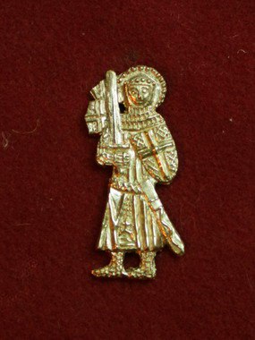 Изображает пешего рыцаря в подном доспехе, со щитом и обнаженным мечом. За спиной его развеваются знамена. А вокруг головы - нимб. На щите и знаменах рыцаря - крест, по форме могущий иметь отношение к геральдике крестоносцев. Именно геральдический крест участника крестовых походов и нимб указывает на то, что бэдж выпускался в честь Крестовых походов и их участников. И подчеркивает святость Крестовых походов, как таковых, в сознании людей Средневековья. Ведь крестоносцам обещалось полное прощение грехов всем погибшим за освобождение земель от неверных. Франция, XIV- XV в.