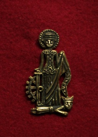 Изображает святую Катерину Александрийскую с атрибутами ее мученической смерти (колеса, на котором святую пытали и меча, которым обезглавили). Незамужним девушкам молитва святой Екатерине помогает быстрее найти вторую половинку, а замужним - обрести и сохранить мир и любовь в браке. Англия, XIV-XV в. По книге Brian Spencer "Pilgrim souvenirs and Secular badges".