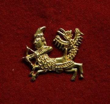 Изображает фантастического кентавра, который имеет черты химеры. Передняя часть традиционно человеческий торс мужчины, нятягивающего лук. Вместо хвоста у него рогатое крылатое чудище, смотрящее в противоположную сторону. В христианстве кентавр символизирует чувственность, необузданные страсти, излишества, прелюбодеяние. Этот персонаж служил олицетворением человека, разрываемого между добром и злом, еретика, который хоть и знает учение, но применяет его неверно. В средневековой символике кентавр считается противоположностью благородного рыцаря и олицетворением высокомерия. И потому может быть отнесен к сатирическим. Нидерланды, 1355-1440гг. По книге Jos Kolderweij "Sieraad en devotie in middeleews vlaandreen".