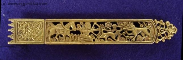 Ременной наконечник от поясного набора, найденном в кургане 6 у станицы Белореченской на Северном Кавказе в 1896 г.14- рубеж 15 в. Золотая Орда, Крым или Малая Азия.