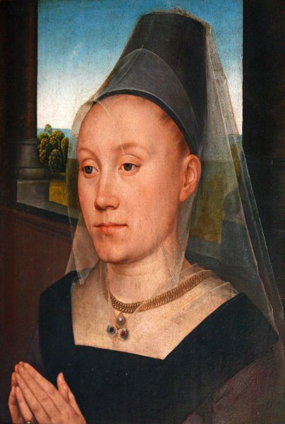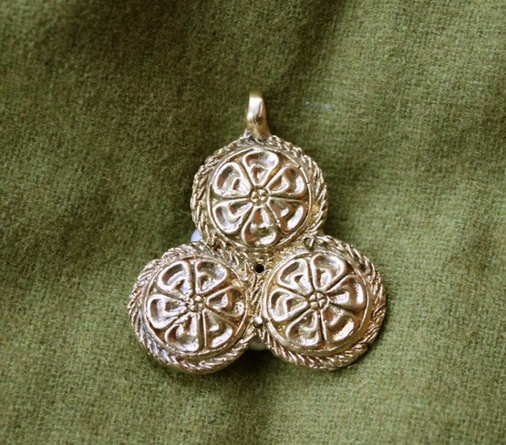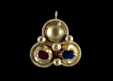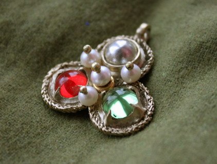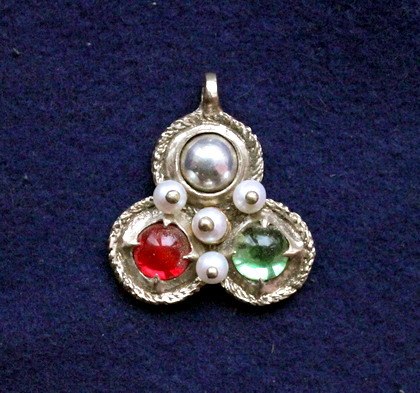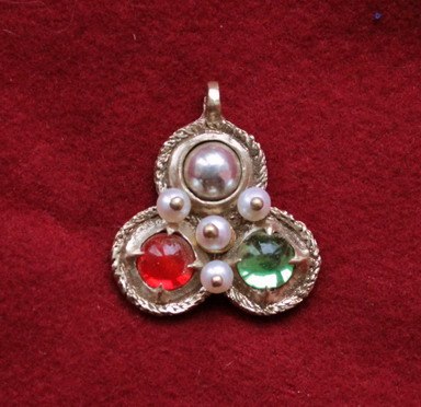 Женская подвеска со стеклом и жемчугом. Часто встречается на портретах европейских знатных дам XV - начала XVI веков (Бургундия, Германия, Англия). Может носиться как шейное украшение в виде кулона на цепочке. Верхняя вставка - посеребреная полусфера, нижние - цветное стекло.
