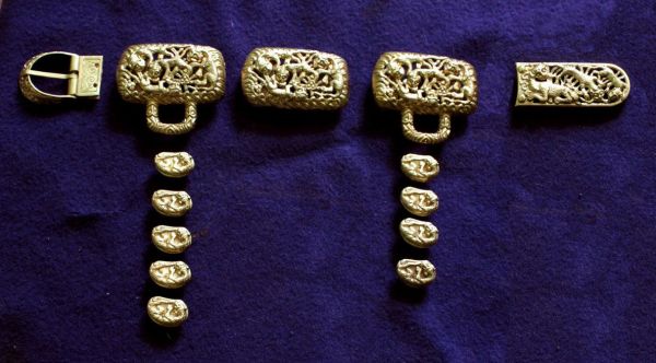 Ременной набор из погребения кургана 7 могильника Олень-Колодезь, Воронежская область. Золотая Орда конец XIII-начало XIV века. Ременной набор состоит из 14 элементов.