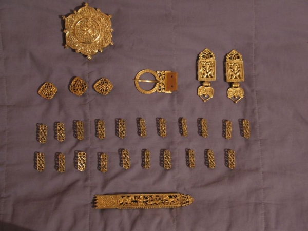 Гарнитура поясного набора состоит из 26 предметов, богато насыщенных декором. Лицевая пластина поясного наконечника украшена рельефным изображением сцены "героической охоты". Спешившийся лучник, за спиной которого стоит оседланный конь, с колена стреляет в пасть льву, возможно, волшебной стрелой (ее хвостовая часть украшена розеткой в виде цветка). В логово льва охотника приводит собака.