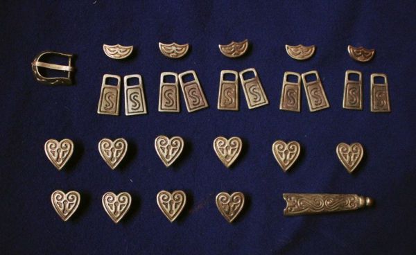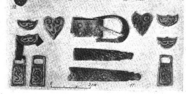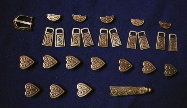 Ременной набор, обнаруженный во время археологических раскопок в Новгороде в слоях рубежа XIII - XIV века. Состоял из пряжки, 3 сердцевидных бляшек, 4 накладок в виде полумесяца и 3 привесок трапециевидной формы, которые крепились к ним. Также в набор входили 3 поясных наконечника-хвостовика. Все элементы были отлиты из меди, а рисунок заполнен красной эмалью, почти не сохранившейся. Отсутствие аналогий в курганных материалах даёт основание предполагать, что работа принадлежит местному мастеру-ювелиру. К сожалению, реконструкция этого пояса в оригинальном виде не представляется возможной: нет плана расположения найденных деталей, явно отсутствует несколько элементов набора. Мы предлагаем более традиционный вариант с большим количеством накладок, чем в оригинальном поясе. Поясной набор выполнен из латуни, но по желанию заказчика и за отдельную плату можно изготовить из меди и украсить эмалью.