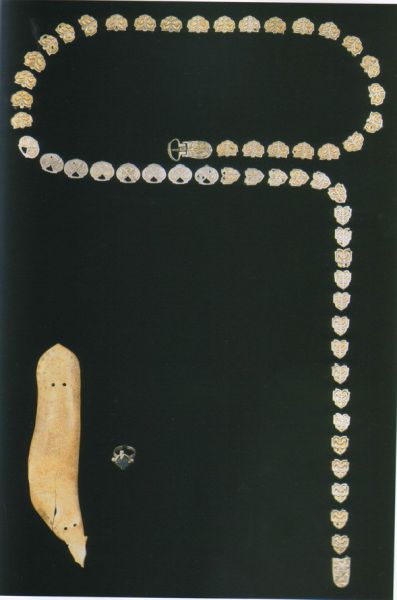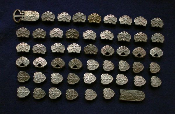 Ременной набор из Rétközberencs, погр. №14, Венгрия, 10 век. Немного уменьшено количество накладок от оригинала. Ременной набор состоит из 52 элементов.