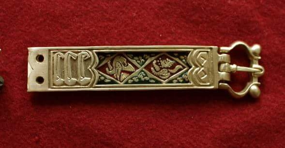 Пряжка с креплением для средней ширины пояса. Происходит из Симферопольского клада зарытого предположительно в конце 14 века, перед нашествием Тимура, Поясной набор вероятно происходит из одной из генуэзских колоний в Крыму. Украшен Горячей эмалью.