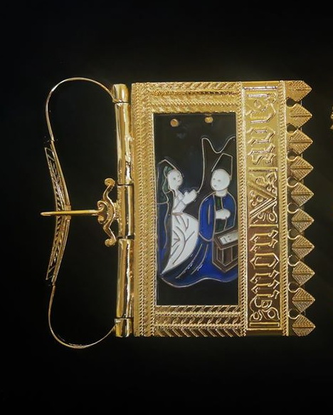 Пряжка с креплением для широкого пояса для роба. Оригинал храниться в Национальном Германском музее, Нюрнберг, 15 век. Происходит предположительно из Франции. Надпись "mon v ave" сокращенно от "mon coeur vous avez"