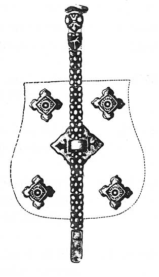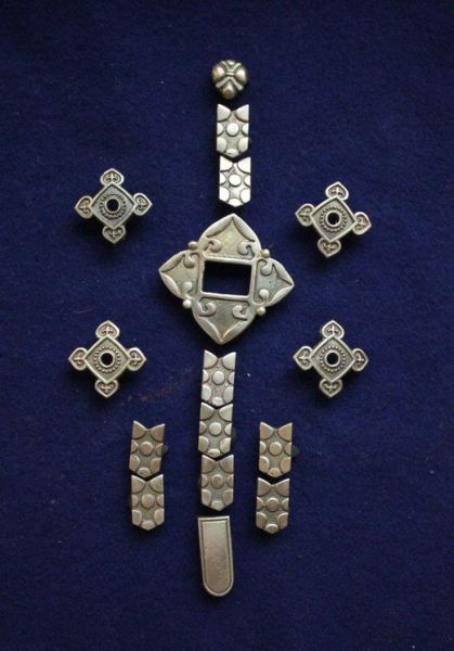 Набор бляшек на ташку, Киевскя русь 10 век, предположительно находка из Чернигова.17 элементов. 1 центральная, 4 боковых, 10 на ремешок, 1 особая на ремешок, 1 узкий хвостовик для ремешка.