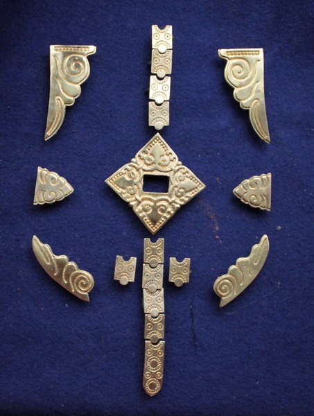Набор бляшек на ташку. Киевская Русь 10 век, с. Шестовица Черниговской области, курган 42. Хранится в Черниговском историческом музее.18 элементов. 1 центральная, 6 боковых, 10 на ремешок, 1 узкий хвостовик для ремешка.