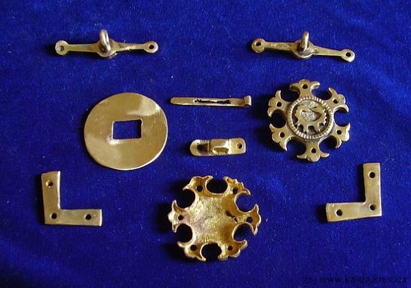 Набор на кошель Новгород 13 век.8 элементов. 1 центральна накладка, 1 задняя пластинадля замка, 2 накладки-уголка, 2 подвеса с кольцами, 1 скоба для замка, 1 язычок для замка.