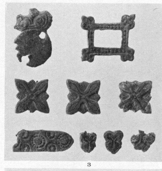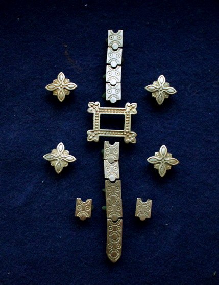 Набор бляшек на ташку. Бирка, Швеция, 10 век. Составлено из отдельных находок с разных курганов16 элементов. 1 центральна, 4 боковых 10 на ремешок, 1 узкий хвостовик для ремешка.