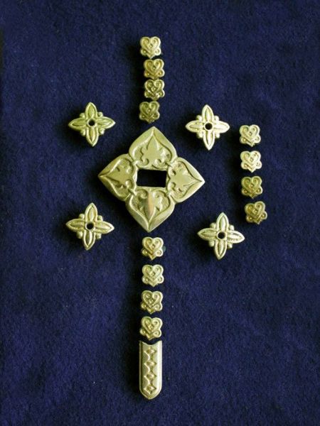 Набор бляшек на ташку. Гнездово, Смоленская область, 10 век, Составлено из отдельных находок с разных курганов18 элементов. 1 центральна, 4 боковых 12 на ремешок, 1 узкий хвостовик для ремешка.