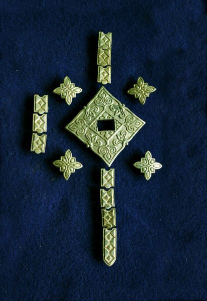 Набор бляшек на ташку. Гнездово, Смоленская область, 10 век, Составлено из отдельных находок с разных курганов16 элементов. 1 центральна, 4 боковых 10 на ремешок, 1 узкий хвостовик для ремешка.