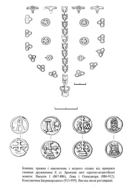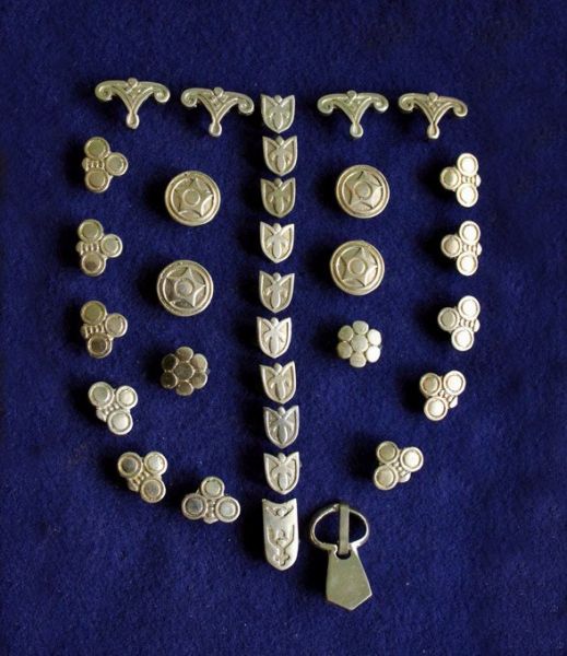 Набор бляшек на ташку. Киев 10 век. Хранится в Киевском археологическом музее.33 элементов. 31 окантовочная бляшка, 1 маленькая пряжка, 1 узкий хвостовик для ремешка.