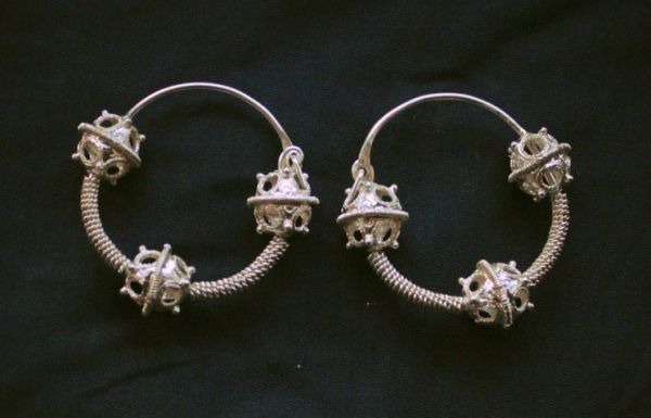 Трехбусинные височные кольца 12-13 век. Так называемы Киевский тип, Имели широкое распространение от Киева до Новгорода. Часто собирались на ленту по нескольку штук заканчивающуюся например звездчатым колтом. Цена за пару, в цену входит серебрение или позолота.